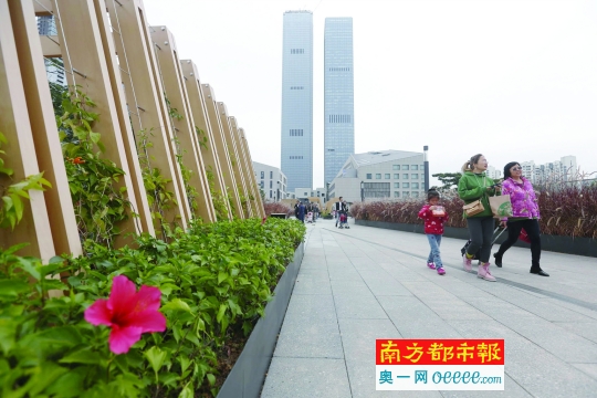 值得一提的是,该空中连廊长度在深圳同类项目中是最长的。深业上城项目总经理冯永异表示,人行连廊从莲花山公园起一直连通至笔架山公园,“莲花山到深业上城裙楼400米,公共开放空间400米,从这个空间再到笔架山又有400米,长度约为1 .2公里。”而率先建设完成的公共开放空间,早在2018年7月就开放给市民使用,但连接两座山的廊桥部分,则尚未能接通。