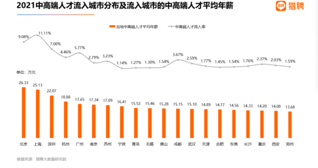 从中高端人才流入分布最多的20个城市来看,上海最高,为11.11%;北京位居第二,为9.08%。深圳、广州、杭州位居第三至第五,为7.0%、5.77%、4.46%。其他城市均低于4%。从这20个城市的中高端人才平均年薪来看,北京、上海、深圳位居前三,均超20万,分别为26.33万、25.13万、22.07万元。杭州、广州、南京、苏州位居第四至第七,分别为18.88万、17.65万、17.34万、17.09万元。