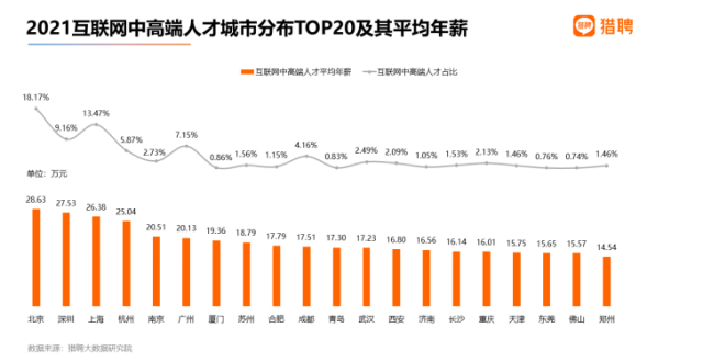 从互联网中高端人才的平均年薪来看,超过20万的有六个城市,分别是北京、深圳、上海、杭州、南京、广州,对应的薪资为28.63万、27.53万、26.38万、25.04万、20.51万、20.13万。其中北京、深圳、上海、杭州的互联网中高端人才平均年薪均超25万,这与这些城市的互联网发展程度高、经济发达、人才济济密切相关。