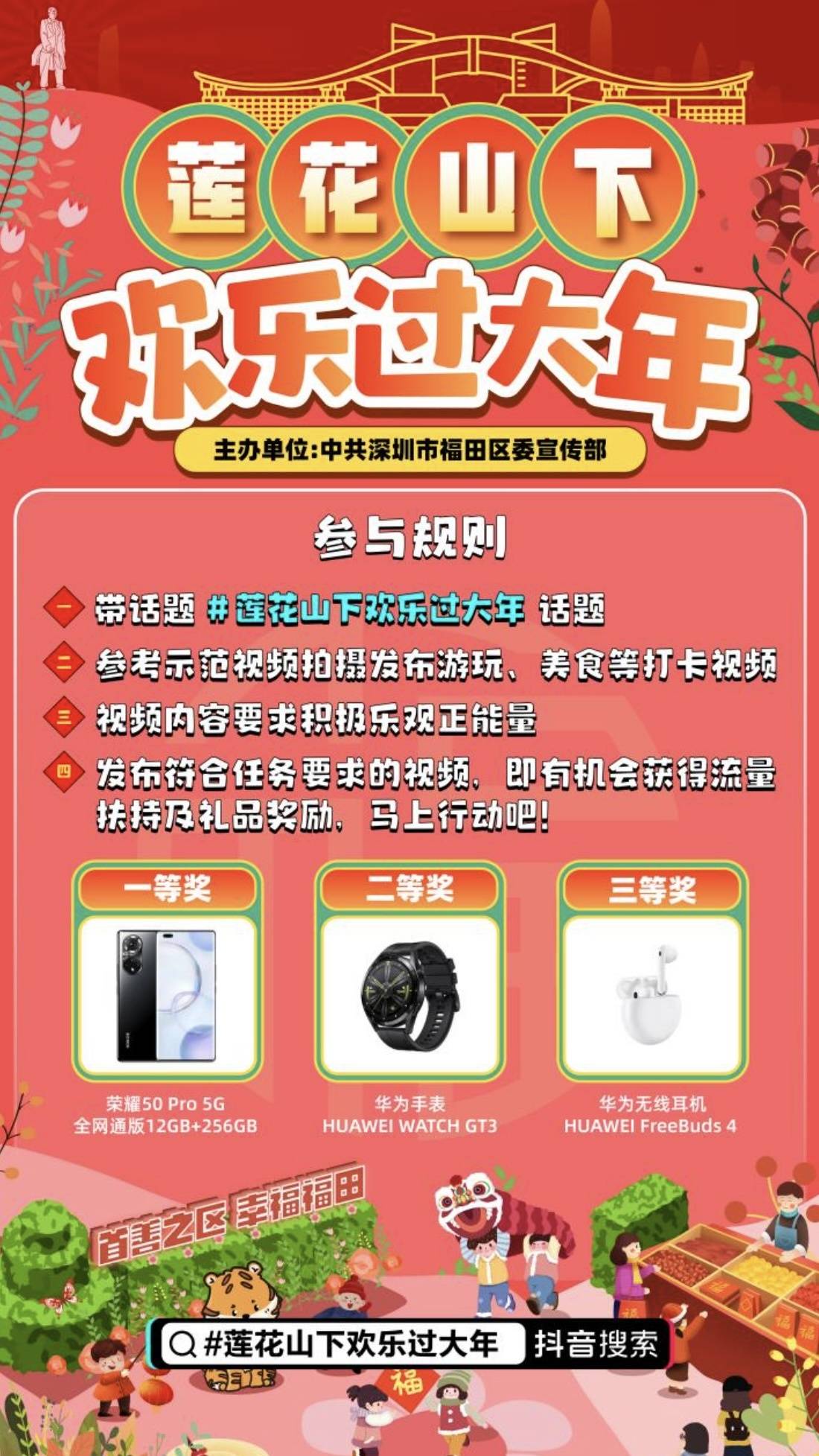 活动在上线期间还会设置流量加推奖励,针对参与本次活动的优质视频进行流量加推,这也意味着,加上#莲花山下欢乐过大年 这个话题,视频就可能会有更多人看见,你所记录的福田“年味”就能传播得更远,远处的家乡也有机会接收到你的新年“福气”。