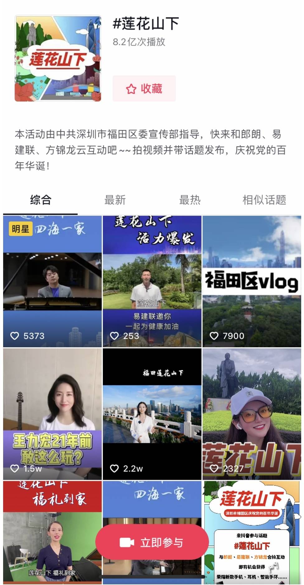 此次活动,福田区委宣传部官方抖音账号已发起话题#莲花山下欢乐过大年,只要抖音用户在发布视频时添加话题#莲花山下欢乐过大年 + @i福田,将所拍“年味”一镜到底一键上传即可。