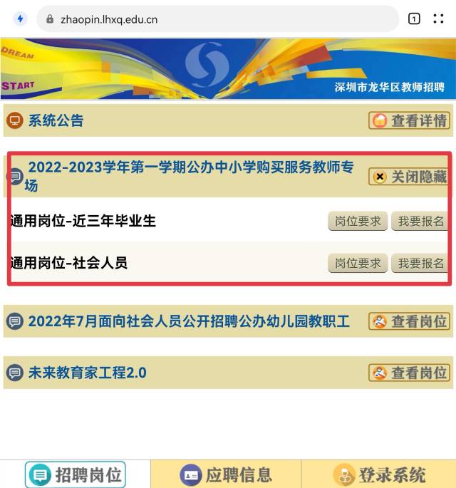 资料填报及上传完成后,需要在招聘岗位里,选择“2022-2023学年第一学期公办中小学购买服务教师专场”对应岗位进行报名。