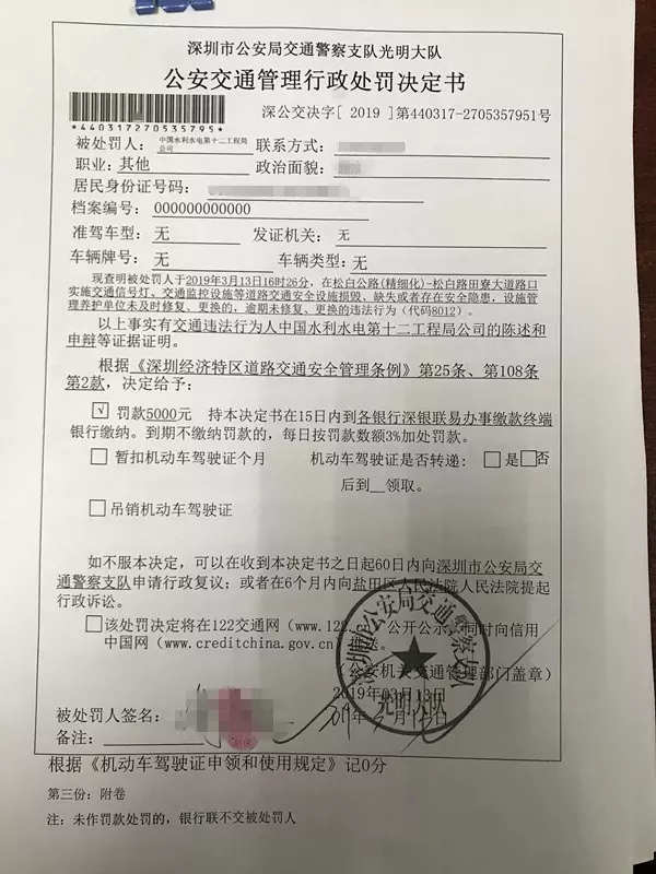 依照《深圳经济特区道路交通安全管理条例》第25条、第108条第2款给予中国水利水电第十二工程局公司罚款5000元的行政处罚,同时开具了《责令整改违反道路管理行为通知书》,责令其立即停止施工,并做足安全警示后再行开工。