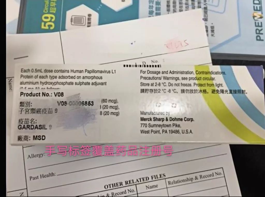 “我现在越来越怀疑接种的来路不明的疫苗。”杨云对记者展示当时接种时拍摄的疫苗包装盒称,注射时,诊所工作人员不让她带走疫苗的针和盒子。并特别强调说,她所注射的疫苗盒上注册号码上覆盖着手写的标签,遮挡了原本应有 “处方药物”以及香港药品注册号的位置,而包装盒内的针剂没有正品要求的“MSD”字样。