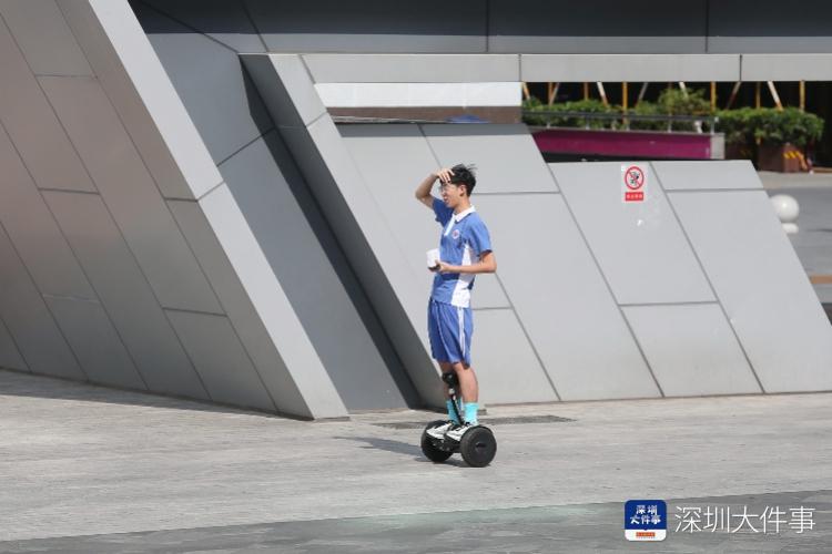 深圳华新地铁站附近,站在电动平衡车的学生。南都记者 刘有志 摄