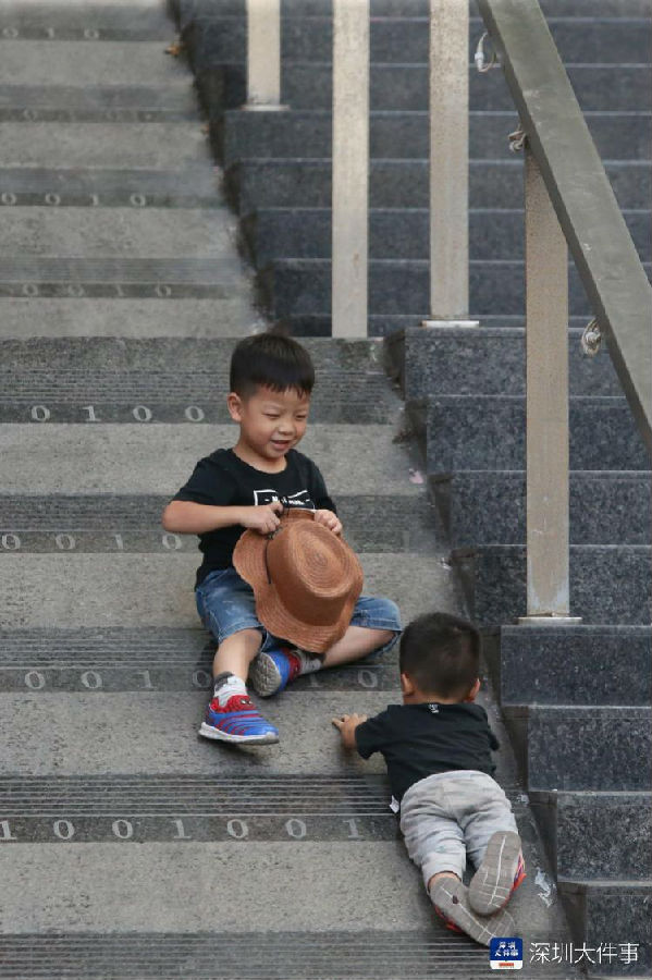 2019年6月16日,深圳华强北步行街,在台阶上玩耍的小朋友。南都记者 刘有志 摄