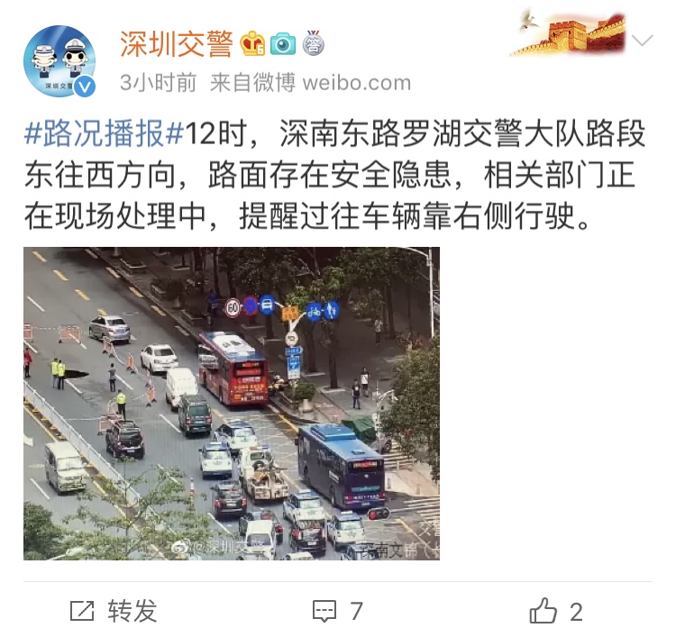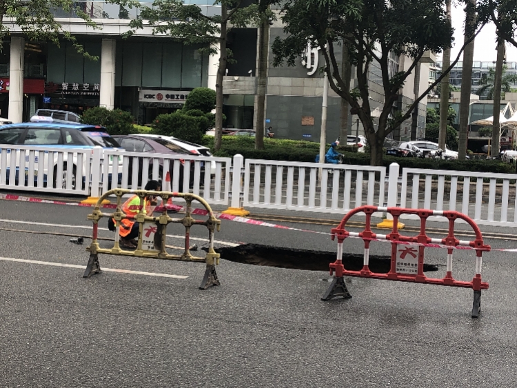 今日中午十一时许,深圳市罗湖区罗湖商业中心附近路段,深南东路西行方向内侧两车道中间发生地陷,目测可以看到一个面积4平米,深约2米左右的坑洞。现场工作人员表示,需进行开挖后寻找塌陷原因并排除隐患。
