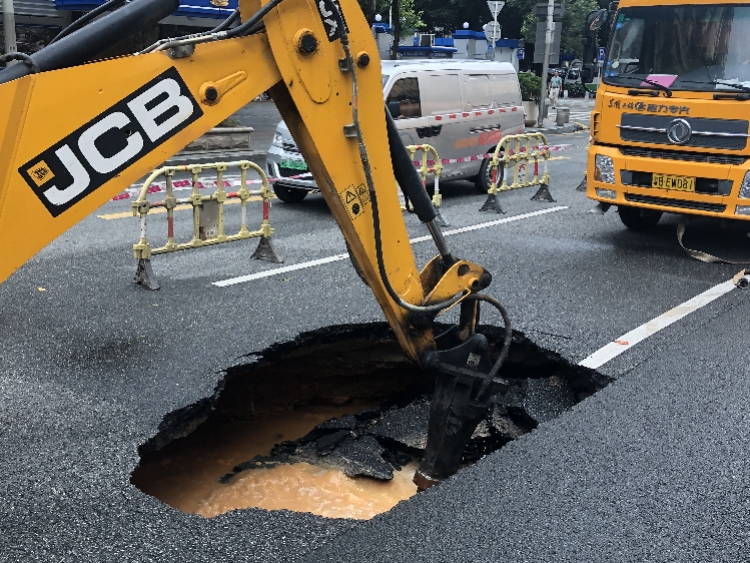 现场有挖机在对路面进行作业,工作人员表示开挖后寻找塌陷原因并排除隐患。