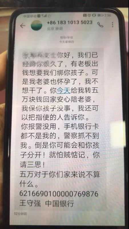 张女士你好,我们已经蹲守你很久了,有老板出钱想要我们绑你孩子,转5万到我账户上,我保你孩子没事。你报警没用,手机和银行卡都不是我的,警察抓不到我,倒是你可能会和你孩子分开!