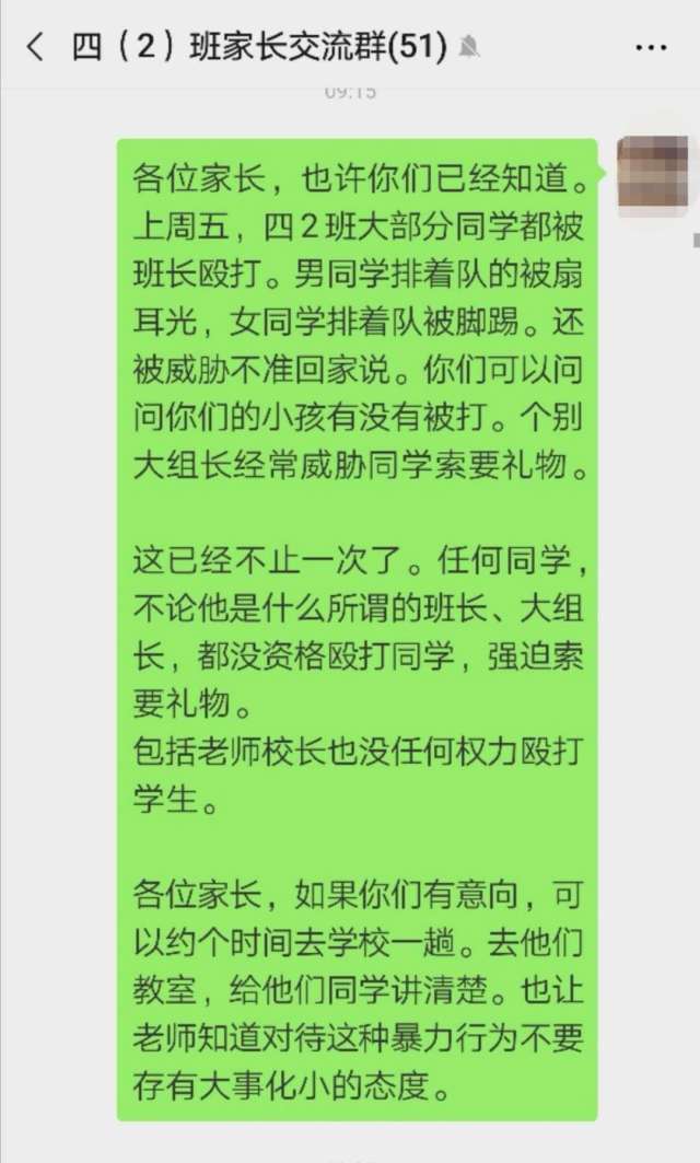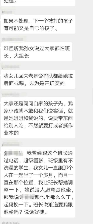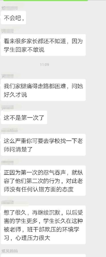 王先生把女儿的情况反映到家长群里,结果群里的家长纷纷表示,自己的孩子也反映当天遭遇到班长的殴打,有的孩子甚至“腿疼得难以走路”。