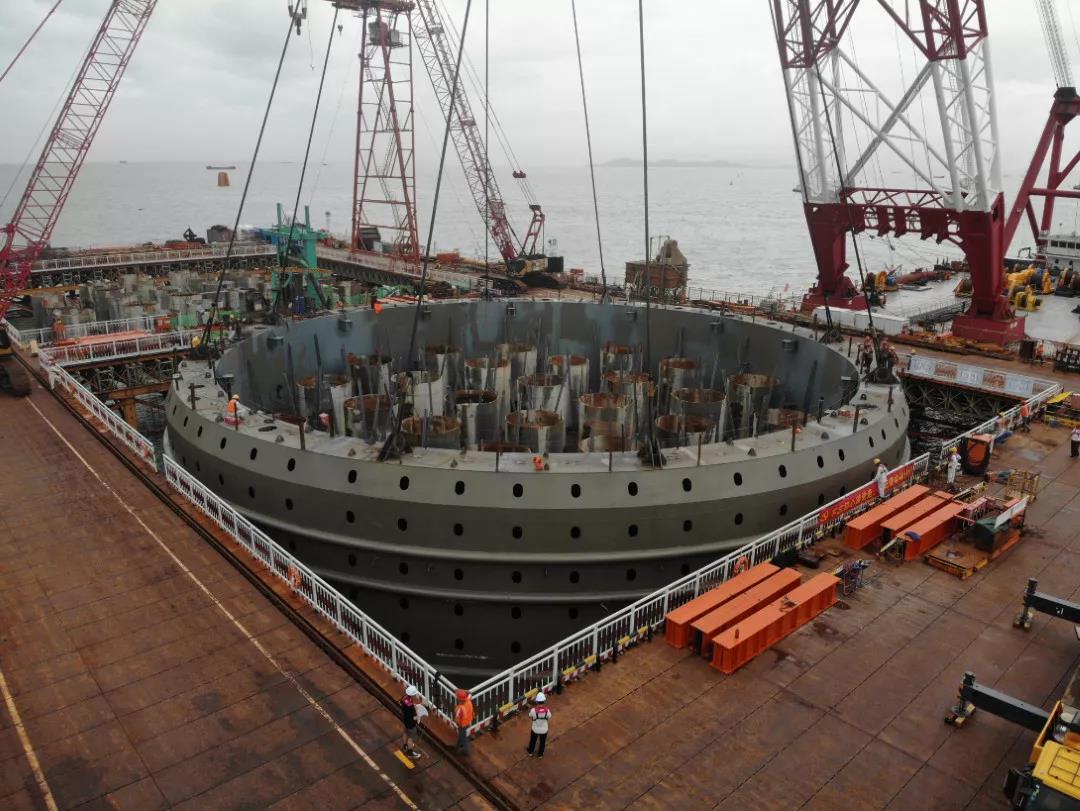 因为伶仃洋大桥承台施工共需下放4个巨型钢吊箱,预计年底完成全部下放,而这次下放的,就是4个巨型钢吊箱的其中一个。