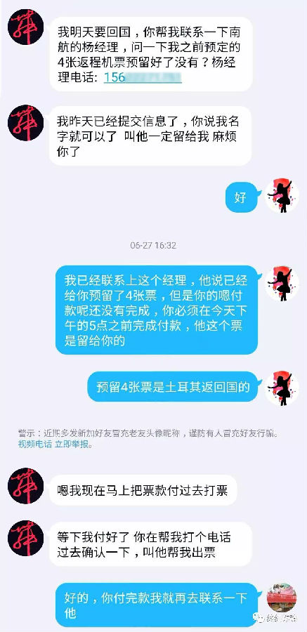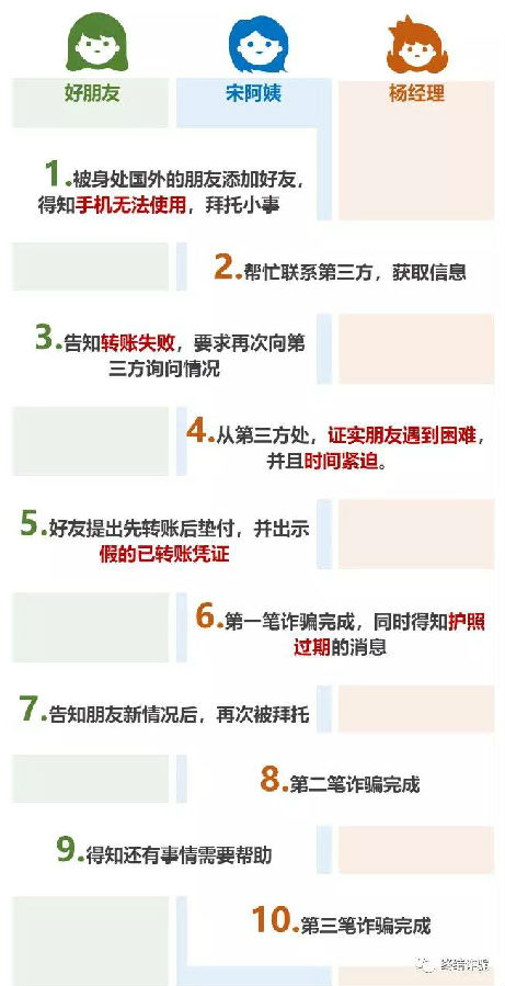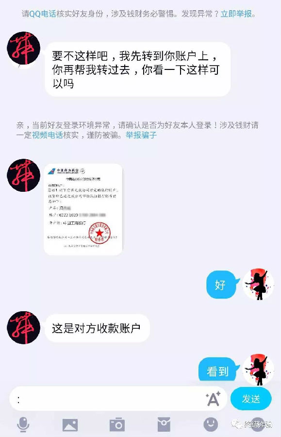 这一套路里,骗子通过黑客手段盗取QQ号,获取对方的好友列表。然后向列表中的所有好友逐个发送请求,遇到热情的回应,就会按照上图一步一步的诱导受害人进圈套,从而实施诈骗。同类型的手法除了:回国帮买机票。还有:国外子女的老师要回国看病、直接借钱等理由。