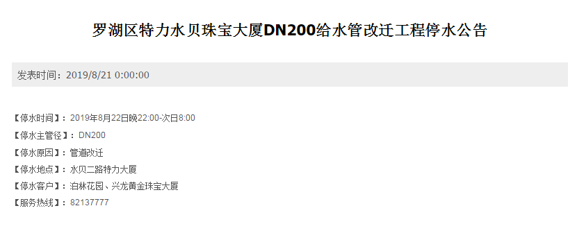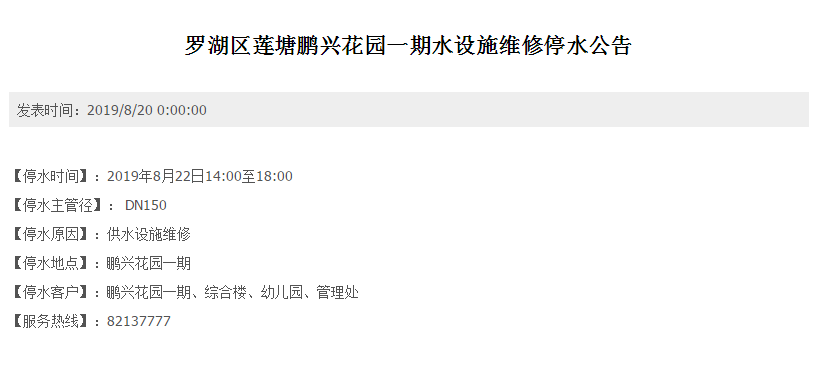 罗湖区莲塘鹏兴花园一期因供水设施维修,停水时间为下午2:00-6:00,需要引起注意。