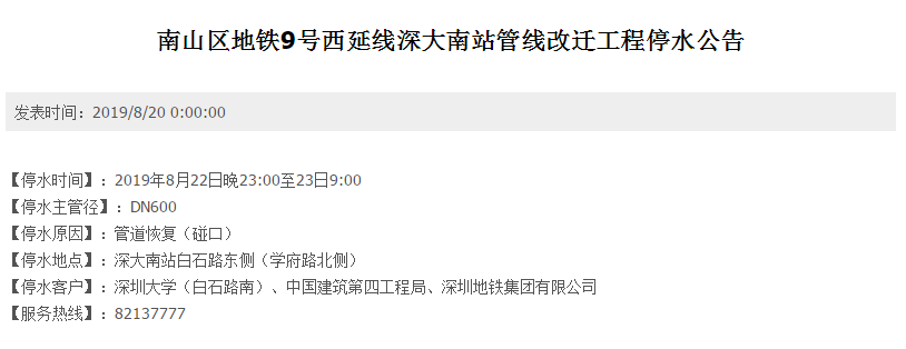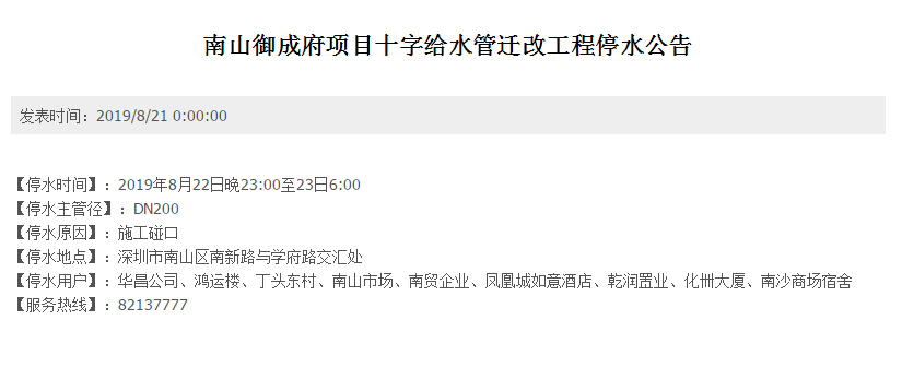 市民请注意,据深圳市水务集团官网消息,下列地区今天将会停水: