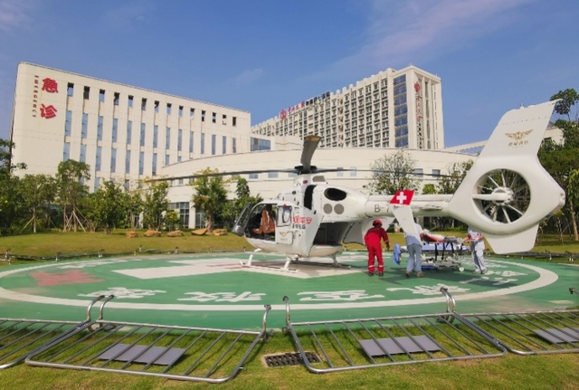 历经10分钟空中飞行,一架机身上喷涂着“平安救援”字样的东部通航空客135双引擎医疗构型救援直升机两次降落在位于深圳光明区的中山大学附属第七医院。10月6日上午,深圳交警、平安产险和东部通航在同一天完成两起事故救援。