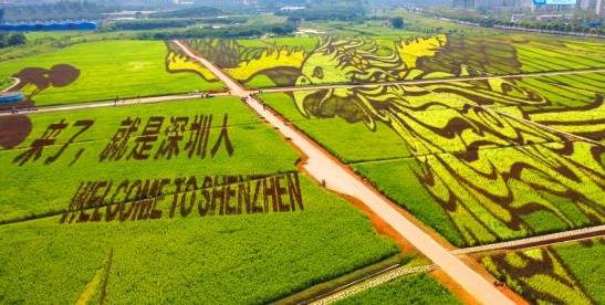 十一国庆,正值金秋收获的时节。以大地艺术献礼,五彩稻田艺术与金黄色向日葵花海交相辉映,位于深圳光明区的华侨城光明小镇・欢乐田园为新中国70周年华诞呈上了一场盛大的“丰收节”。从10月1日开始,为期7天的主题活动吸引大量市民到花海、稻田“打卡”。据了解,作为光明区践行绿色发展理念的重大项目,光明小镇规划了“一轴五片区”功能结构,包括一条贯穿小镇南北的绿道、北部的国家现代农业庄园(欢乐田园)、中部的新一代主题旅游产品、生态小镇、迳口综合产业配套区,以及南部的运动森林公园。