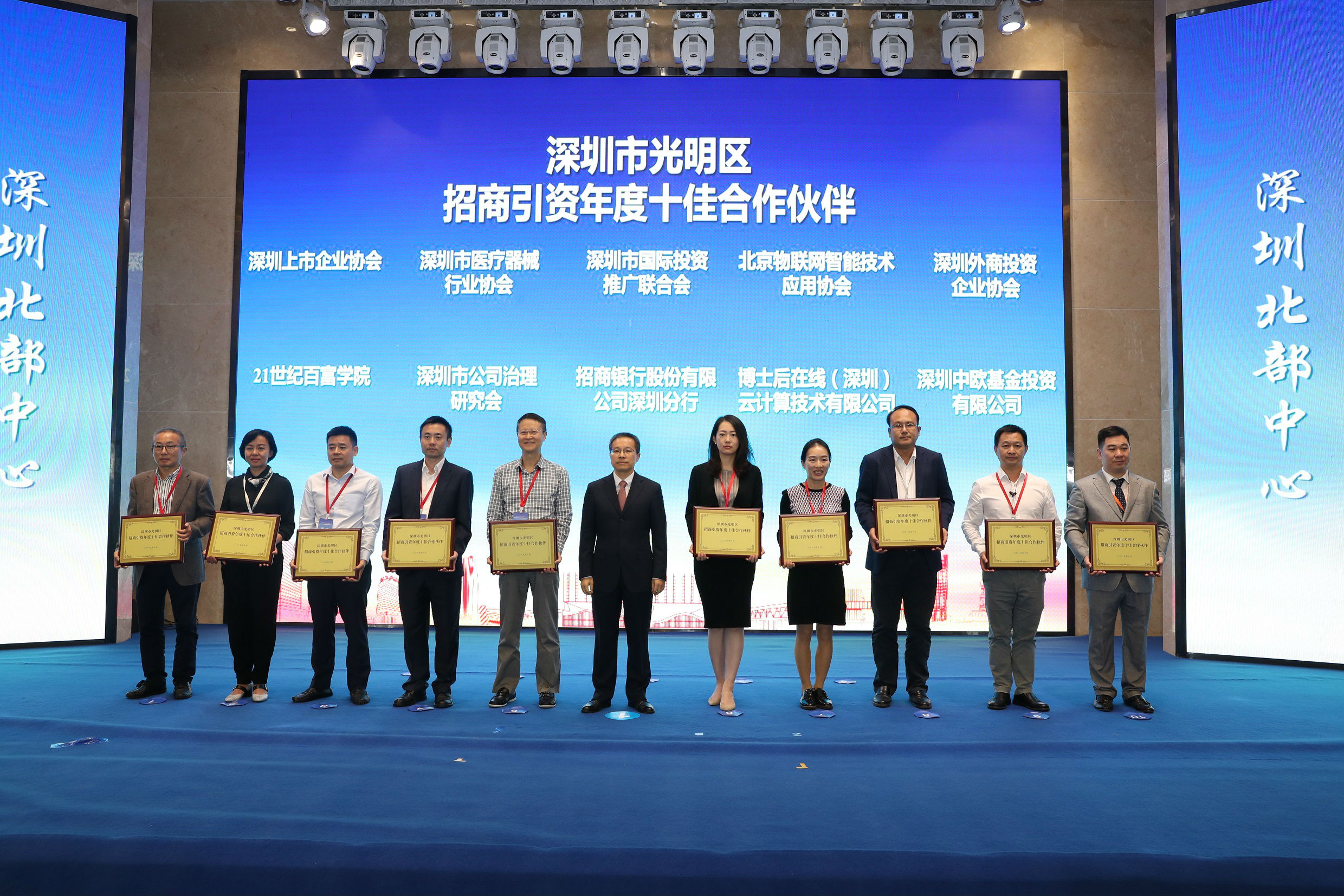 当日投资推介会上,光明区为本年度招商引资十佳合作伙伴授牌,10家招商合作机构分别为深圳上市公司协会、深圳市医疗器械行业协会、国际投资推广联合会、北京物流网智能技术应用协会、深圳市外商投资企业协会、21世纪百富学院、深圳市公司治理研究会、招商银行股份有限公司深圳分行、博士后在线(深圳)云计算技术有限公司、深圳中欧基金投资有限公司等。