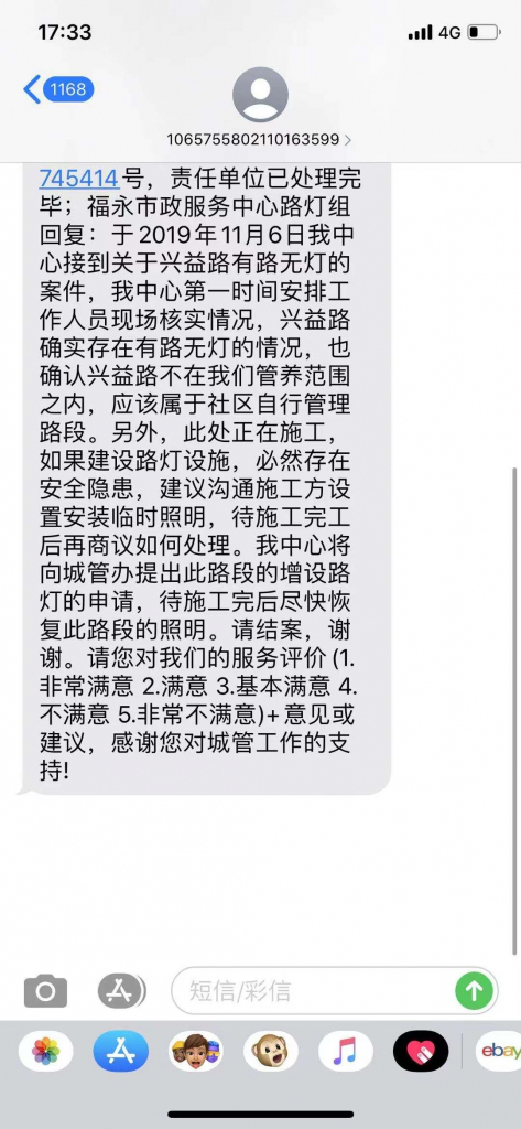 根据报料人吴先生提供的图片,奥一网了解到,福永市政服务中心路灯组于2019年11月6日接收到关于兴益路有路无灯的案件,工作人员前往现场核实情况,确定兴益路有路无灯情况属实。但福永市政服务中心在短信中称,兴益路路灯不属于福永市政服务中心管养范围,而应属于社区自行管理路段,同时提到此处正在施工,如建设路灯设施必然存在安全隐患,建议沟通施工方设置安装临时照明,待施工完工后再商议如何处理。福永市政服务中心表示,后续将向城管办提出此路段增设路灯的申请,待施工完后尽快回复此路段的照明。