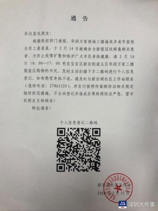 南都讯 2月15日,网上流传出一纸通告,通告指出位于宝安新安街道五区的华润万家商场出现确诊员工。记者第一时间联系了华润万家方面,情况属实。