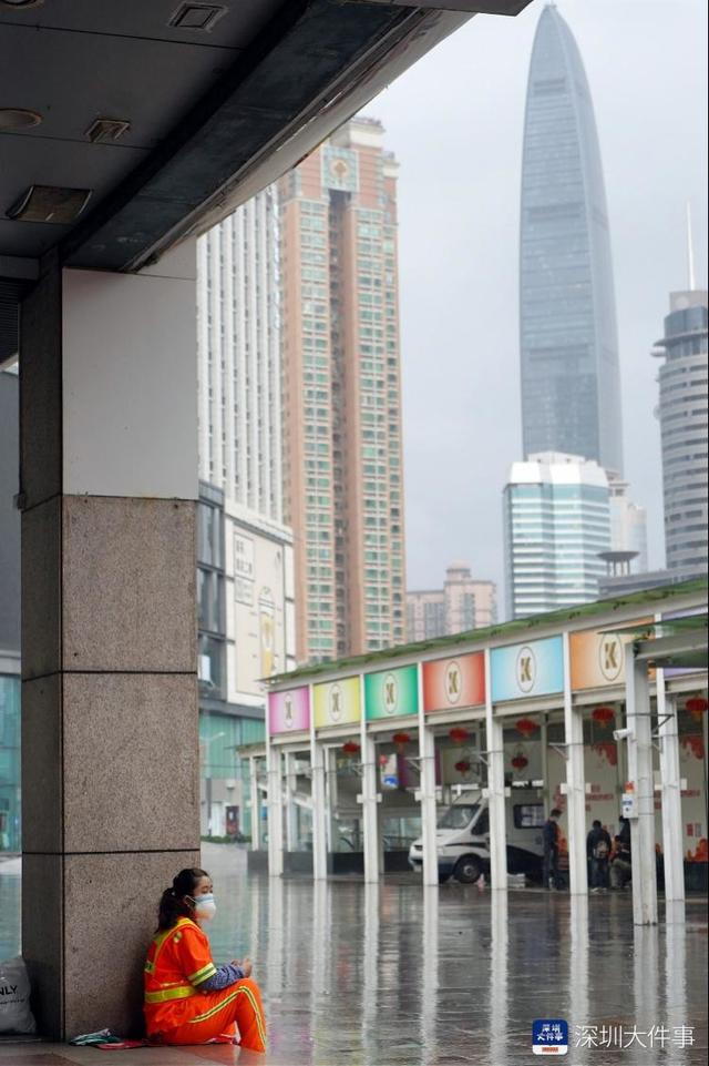 2月15日,深圳东门步行街,坐在路边避雨的环卫工人。南都记者 刘有志 摄