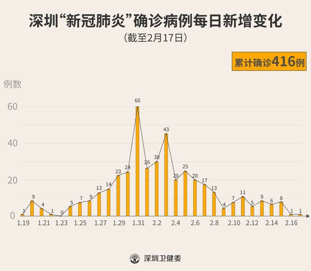 截至2月17日24时,深圳累计报告“新冠肺炎”确诊病例416例。2月17日当天全市新增确诊病例1例。