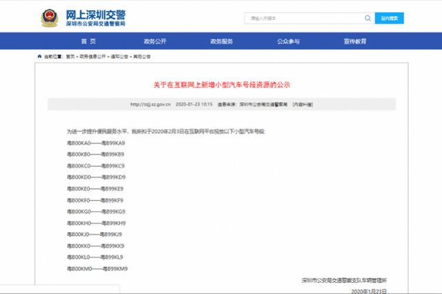 深圳车管所表示,其余批次号段具体发放时间将提前10天左右,在网上深圳交警予以公示,欢迎市民关注相关动态。