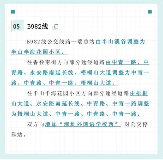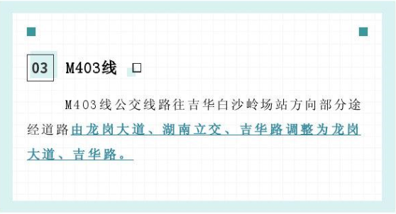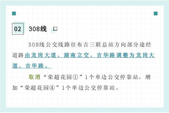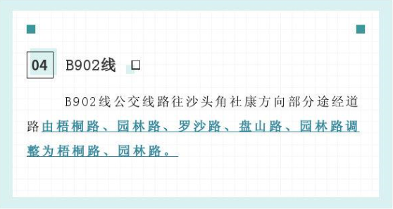 据深圳市交通运输局官方微博2月26日消息,3月1日起,盐田管理局决定调整307线、308线、M403线、B902线、B982线5条公交线路的一端总站、途经道路、停靠站点及服务时间。