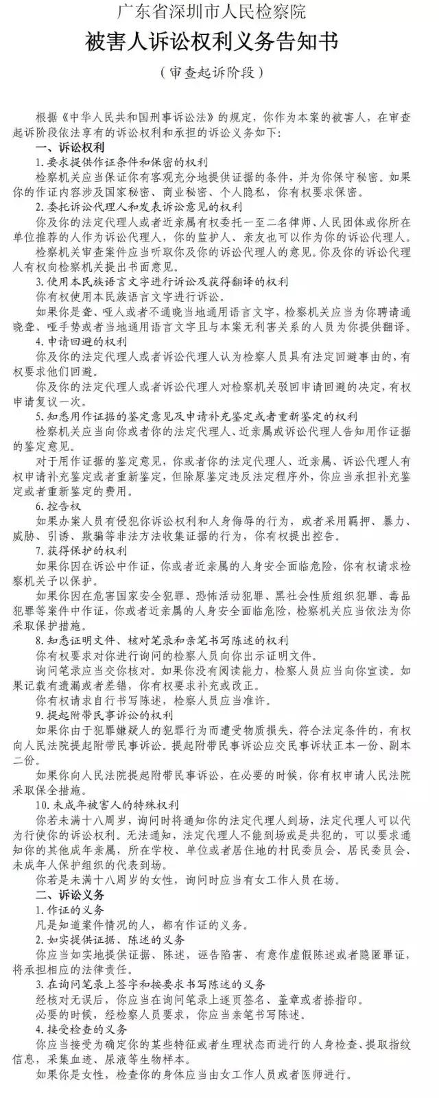 因本案被害人人数众多,根据《中华人民共和国刑事诉讼法》的有关规定,经本院联系,仍有部分被害人无法送达,现采取公告方式告知本案被害人在审查起诉阶段享有的权利义务,详见《广东省深圳市人民检察院被害人诉讼权利义务告知书(审查起诉阶段)》。