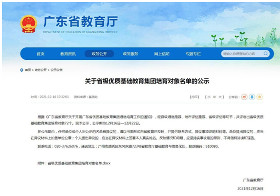 12月16日,广东省教育厅发布了《关于省级优质基础教育集团培育对象名单的公示》。