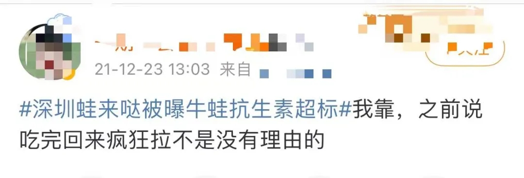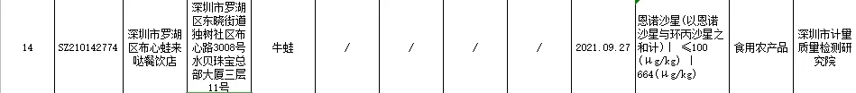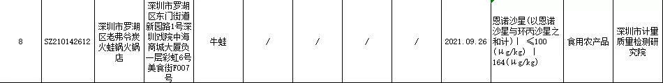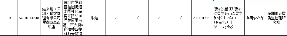 近日,深圳市市场监督管理局官网发布的《深圳市市场监督管理局2021年食品安全抽样检验情况通报(第三十五期)》显示,蛙来哒两间分店销售的牛蛙被检出“恩诺沙星”含量超标,分别超标3.23倍、1.21倍。