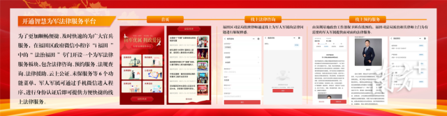 同时,福田区司法局还通过福田区政府微信小程序“i福田”-“法治福田”门户,开通“为军法律服务”特色专题板块,下设法律咨询、预约服务、法规查询、法规援助、公证服务、未保服务等6个线上功能模块。军人军属通过小程序即可享受方便快捷的线上法律服务。