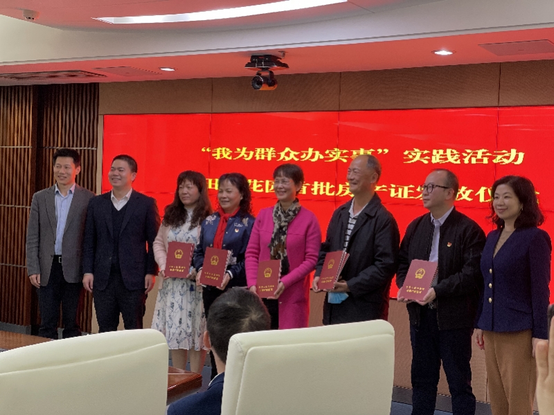 经过5个多月的时间,问题得到解决,居民办理房产证的“路”被打通。12月10日完成田贝花园土地使用权证注销抵押登记、房屋初始登记,成功办理首批12本房产证并完成抵押登记。仪式当天,5名村民代表接过了房产证。
