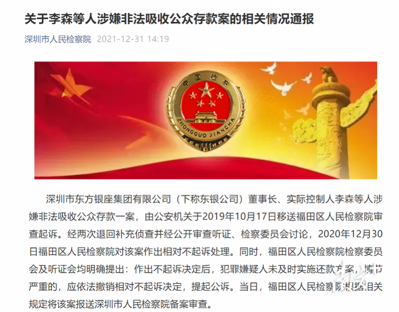 12月31日,深圳市人民检察院通报深圳东方银座案新进展,由于未及时实施还款方案,东方银座集团有限公司(下称东银公司)董事长、实际控制人李森等人涉嫌非法吸收公众存款一案,被深圳市人民检察院依法撤销此前做出的相对不起诉决定,由福田区人民检察院于2021年12月30日依法提起公诉。目前,福田区人民检察院已对李森、钟永基、李超伟均采取了逮捕的刑事强制措施。
