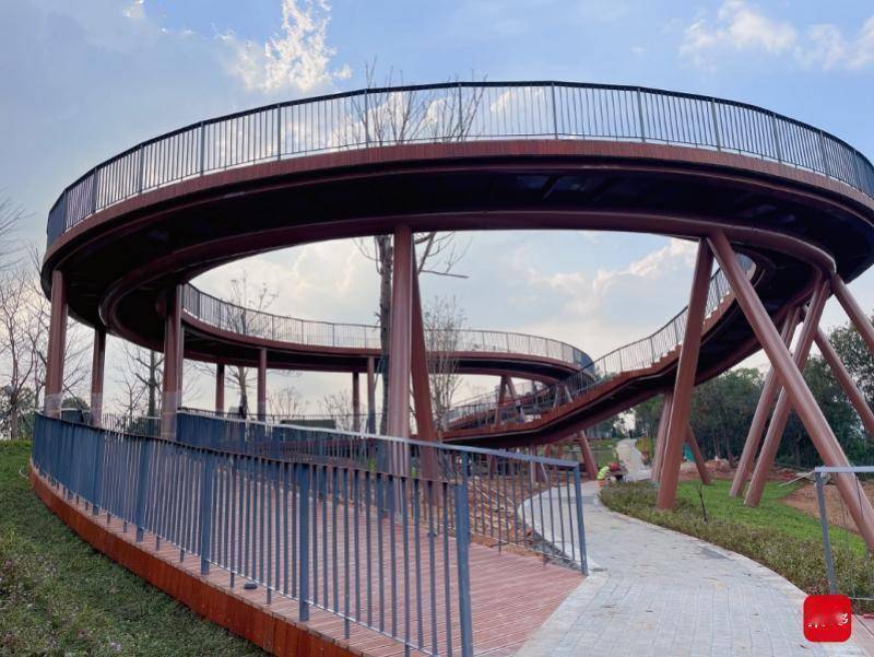 云中漫步栈道:位于公园西南侧,该处为公园制高点,高约5米,全长约210米。栈道结合场地地形及高差、观赏视线及体验感,布置有停留观赏性节点及快速型通行栈道。栏杆设有科普导视牌,让游人在一览中心城美景的同时,增进自然知识,打造山尖云端交相融合、树木掩映的空间感受。