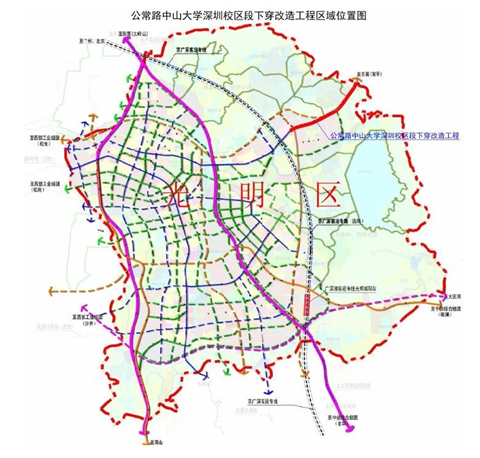 公常路中山大学深圳校区段下穿改造工程位于深圳市光明区,道路全长3.56km,其中地下道路长2.645km。