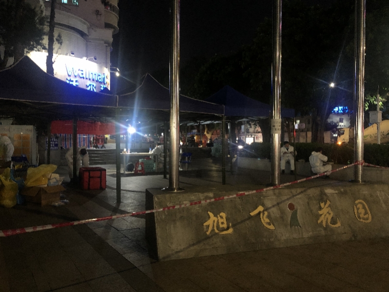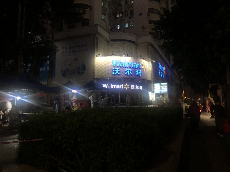 1月11日晚,南都记者发现,在八卦二路一号,沃尔玛超市红岭店和周边部分商铺的灯牌仍然亮着,但均已大门紧闭。与此同时,南都记者注意到,沃尔玛超市红岭店位于旭飞花园B栋1−2层,目前该小区各入口已拉起警戒线,实行封闭管理。此外,有安保人员告诉南都记者,该区域自1月11日早上开始落实“只进不出”管理。“大家都很配合防疫措施,昨天晚上有人在里边一家网吧通宵上网,今早没办法出来也没怨言,由家人寄送衣物转交给他。”据悉,封闭区域内,有医护人员上门采样并登记信息,外卖或其他物资由穿着防护服的工作人员转送入内。
