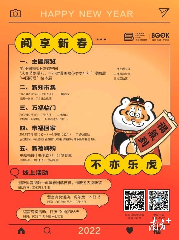 值得一提的是,春节大年初一至初六,“名校校长讲堂”新春特别场、“历史人文讲堂”、“福田演说家”新春表演秀、“深圳晚八点艺术时空——如何布置家居新春氛围?”、“深圳晚八点——追影的人”等精彩纷呈的文化活动拟于中心书城南、北大台阶轮番上演,邀请名家大咖莅临书城,与读者在书中品味幸福;推出“礼”遇2022虎年新春礼品展台,组合名家签名书、新春图书套装、文创精品、虎年“书酒礼盒”套装、“如虎添翼”福袋等新春礼品,献上满满的新年祝福;书城各店、书吧、水吧准备了“新春限量福袋”、“集福攻略”、“集福游戏”、“绘本借阅岛”借阅服务、“新春作业进击营”等惊喜福利,让市民读者度过一个“生龙活虎”的新年。