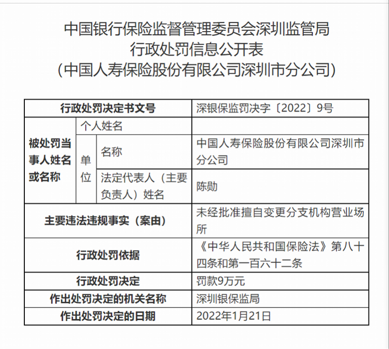 行政处罚信息公开表显示,中国人寿保险股份有限公司深圳市分公司因未经批准擅自变更分支机构营业场所,被深圳银保监局罚款9万元,2名对此行为直接负责的主管人员遭警告并分别罚款7万元、4万元,合计处罚金额20万元。