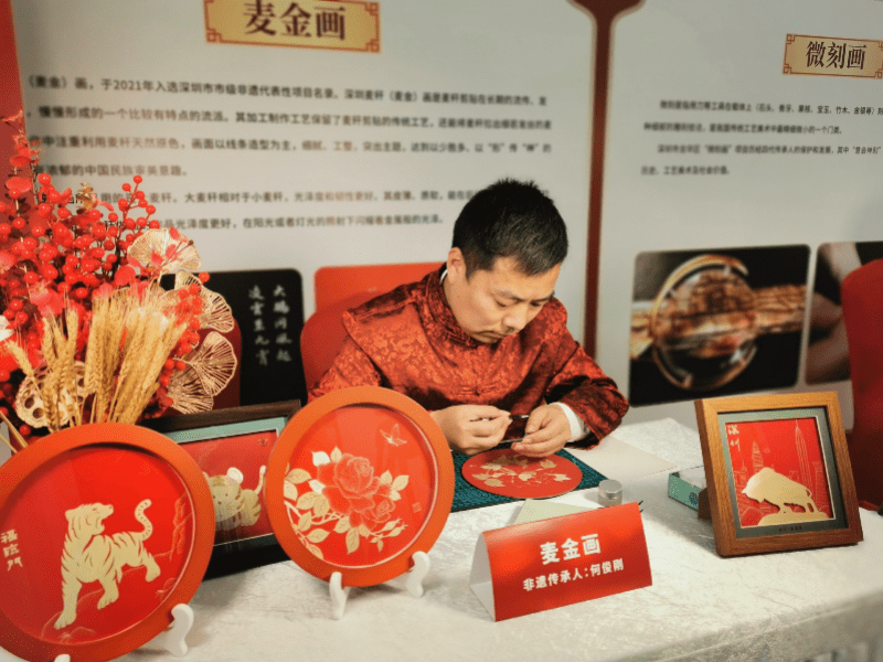 那么,在大湾区的云端逛庙会,感受非遗文化,又是一种什么样的特殊年味?南都记者看到,在本次云端庙会中,各种年味十足的摊位聚集深圳第一高楼。惟妙惟肖的老虎剪纸、精巧绝伦的麦金画、细腻入微的微刻画,三位非遗传承人现场展现“绝活”,吸引市民驻足围观。