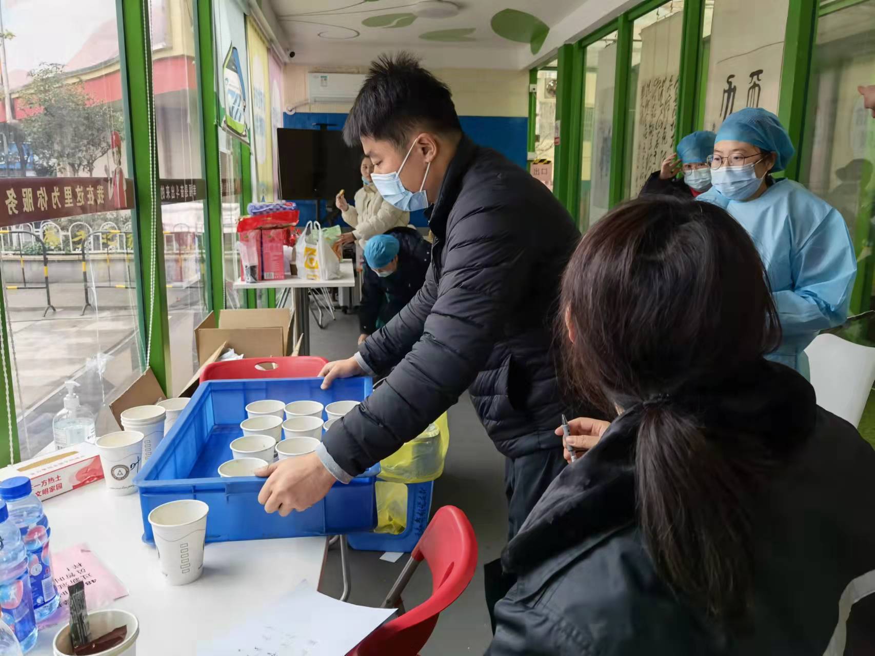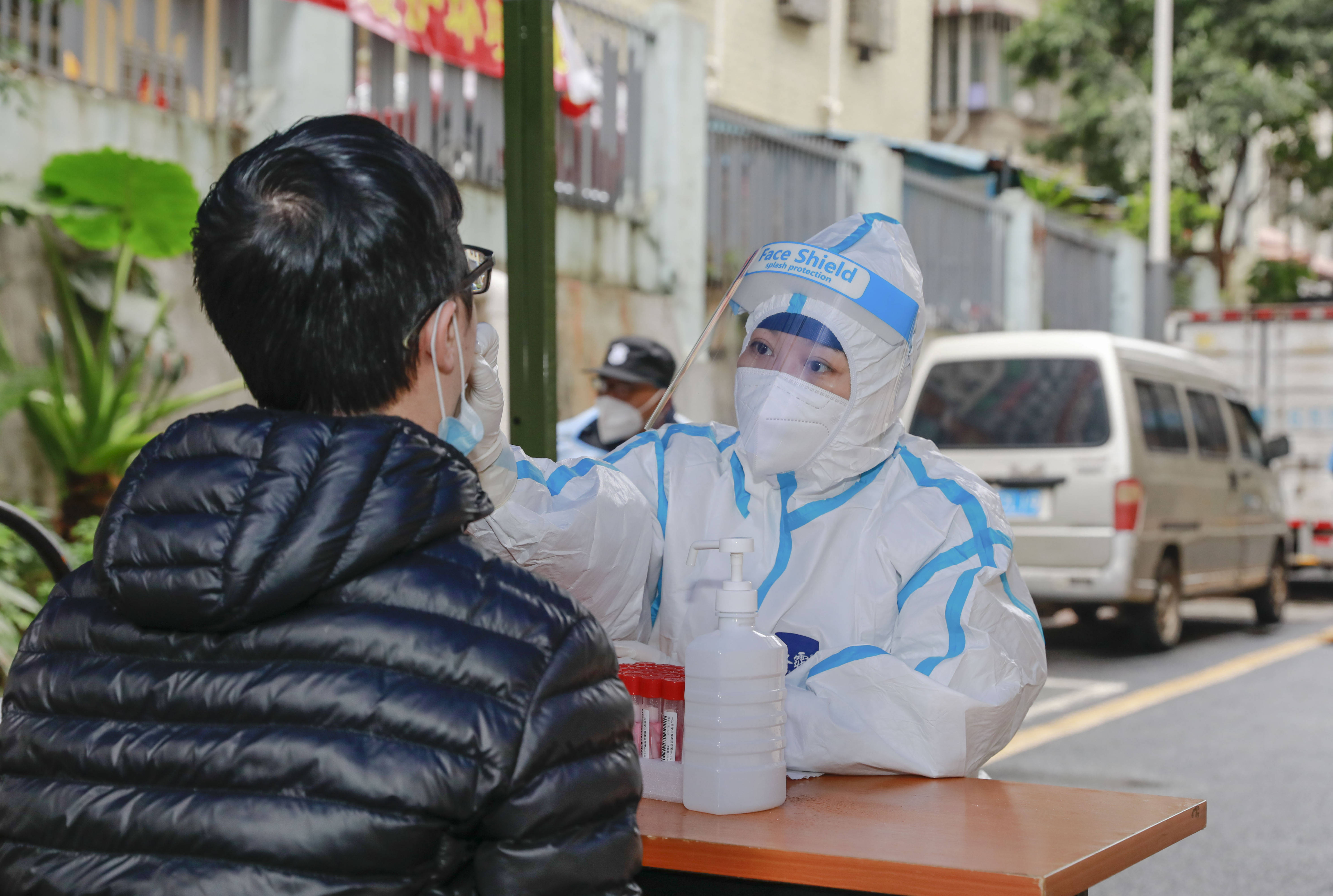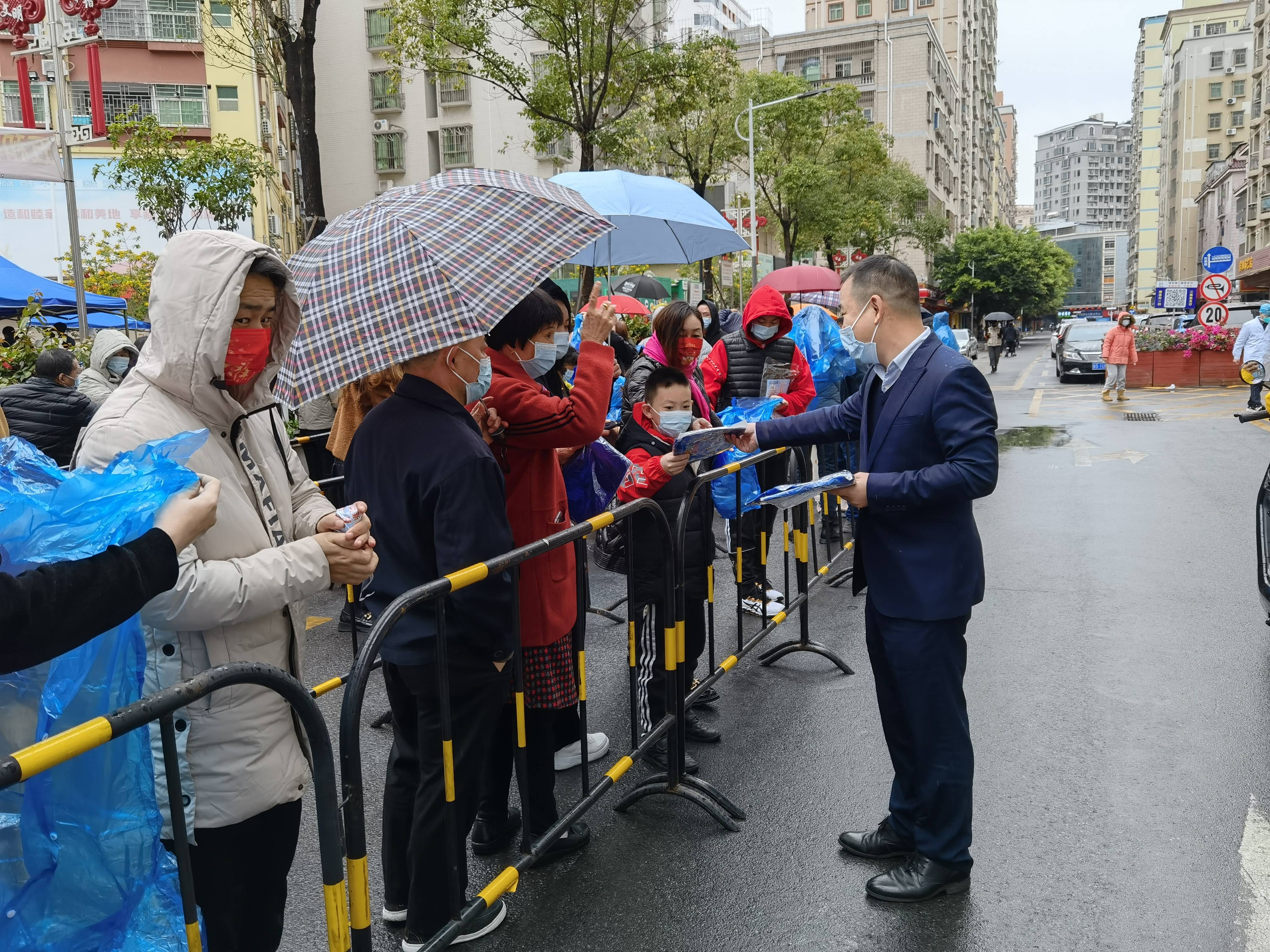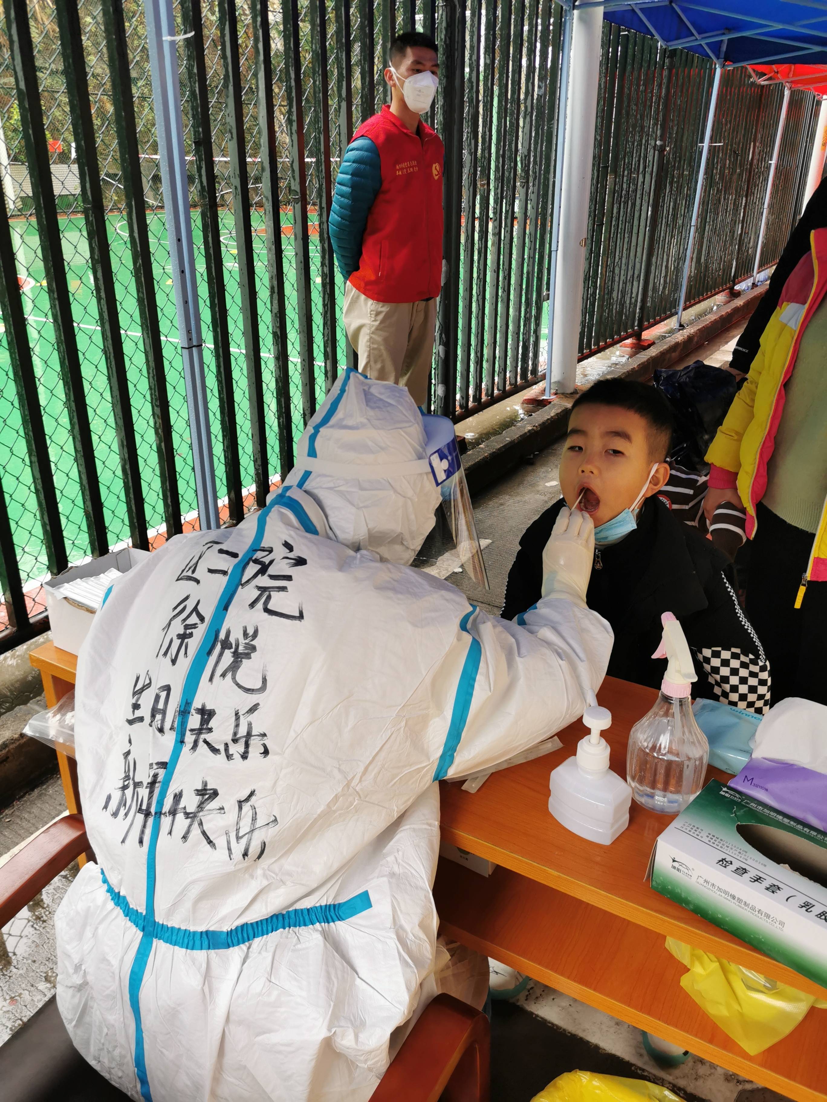 在五和社区,社区书记袁建荣带着工作人员向居民发放一次性雨衣,为现场医护人员和志愿者们端上了姜茶;在万科城社区,居民做完核酸采样后都会真诚地说一句“过年好,辛苦了”。