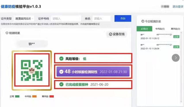 “防疫健康核验一体机”联通粤康码数据平台,通过查验旅客的身份证记录信息,由机器自动识别并播报“正常”“异常”,并同步在工作人员电脑上显示旅客的绿码、48小时核酸检测结果和完成疫苗接种时间等健康信息,只需3到4秒即可通过防疫安检进站候车。