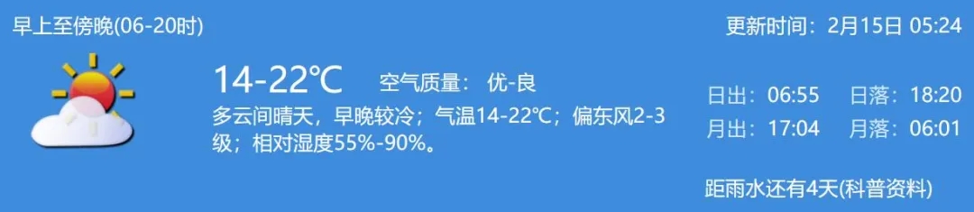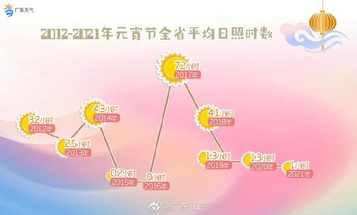 不过即使不下雨,碰上大晴天的概率也不高。因为常年2月份,太阳公公经常“流浪”,所以这个月的日照,也处于一年中的低值区,平均每天只有3.17个小时,比1月少了将近1个小时。而在过去10年的元宵节,有6年是低于常年的数值,阳光最好的17年,达到了7.2个小时。