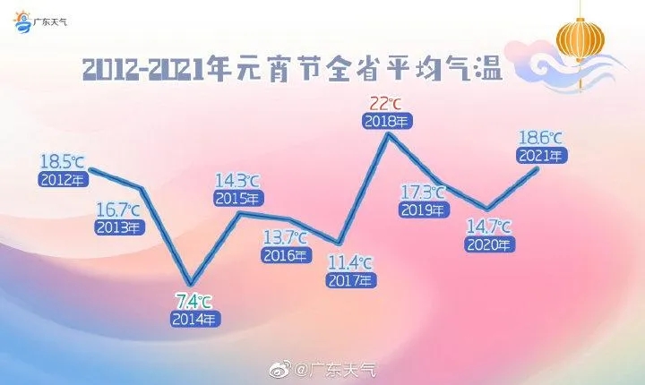 从过去10年元宵节的平均气温来看,最温暖的是18年,平均气温达到了22℃,而最冷的是14年,只有7.4℃,两者相差可达14.6℃。