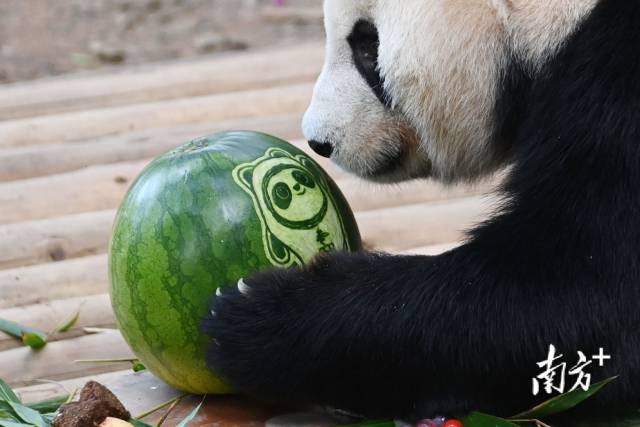 动物园熊猫庄园里,饲养员用西瓜和大熊猫爱吃的食物制作了“水果墩墩”,心意满满。好吃又好看的“元宵大餐”引起了国宝大熊猫的好奇,边玩边吃着喜欢的食物,萌态十足。