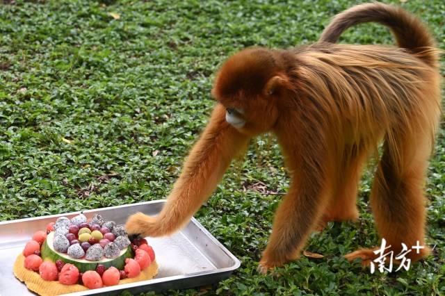 金丝猴吃“水果汤圆大餐”。以窝头为原料做成圆盘,用火龙果、西瓜果肉做成的小圆子摆放在圆盘周围,中间加入熟鸡蛋黄、红枣、提子等食物。寓意团团圆圆,幸福美满。
