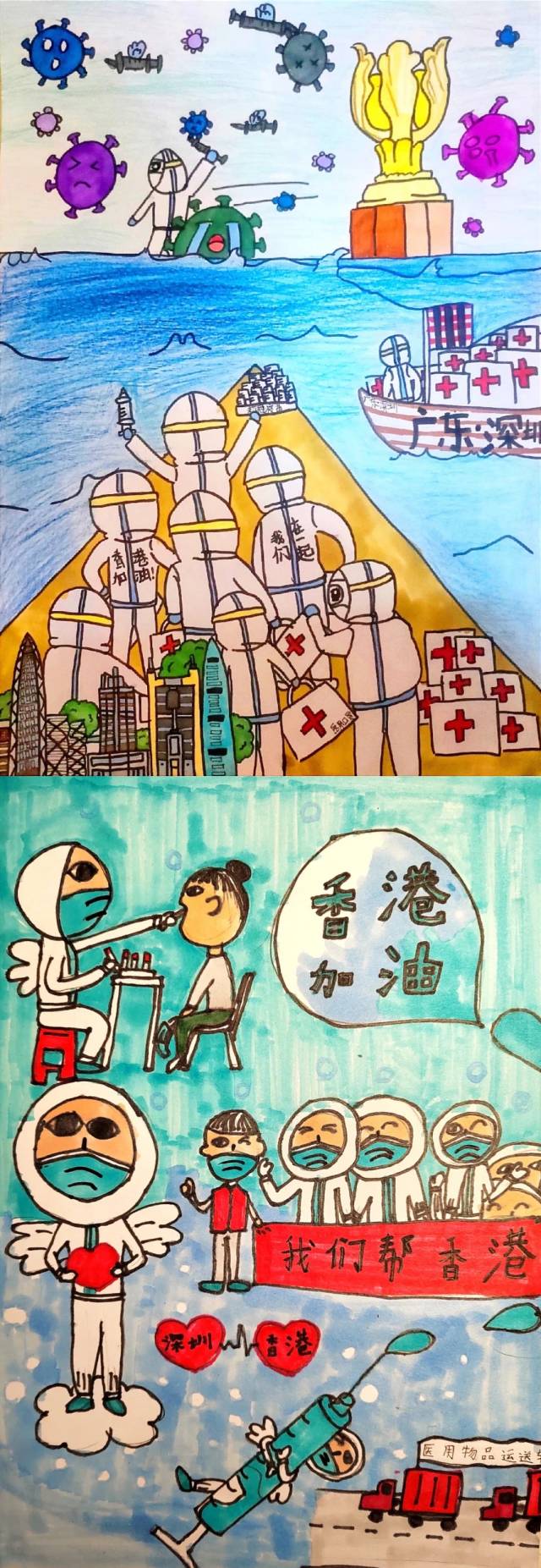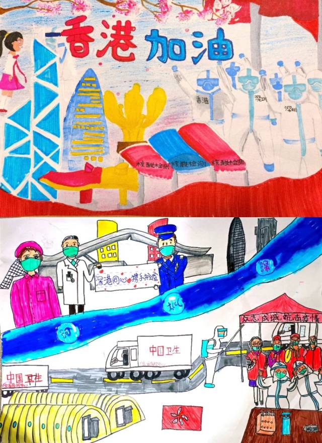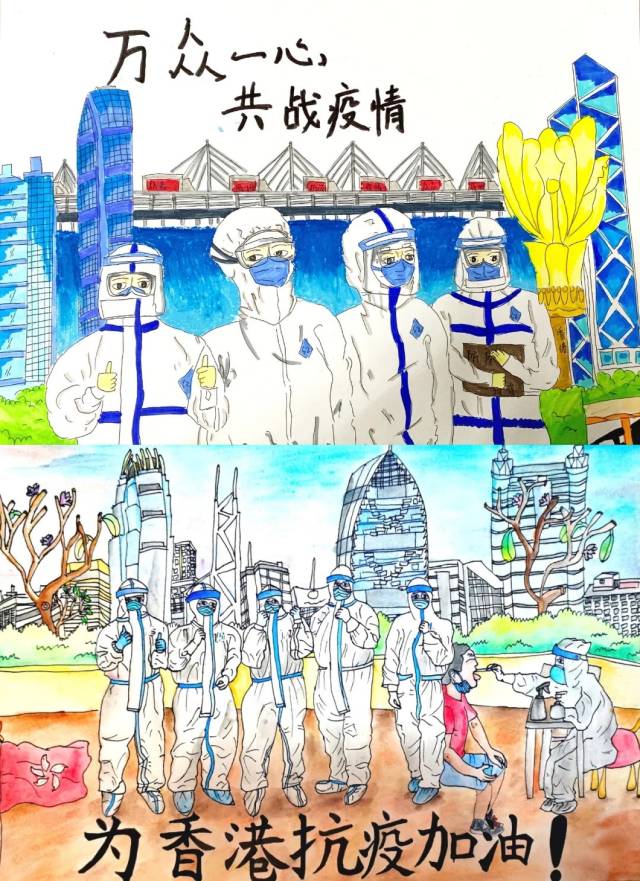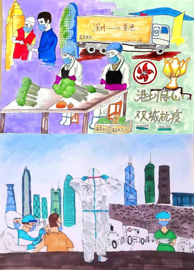 上:作者:黎佳瑶 11岁半 作品名称:港圳同心,双城抗疫 下:作者:黄梓涵 12岁 作品名称:深港同心 共战疫情