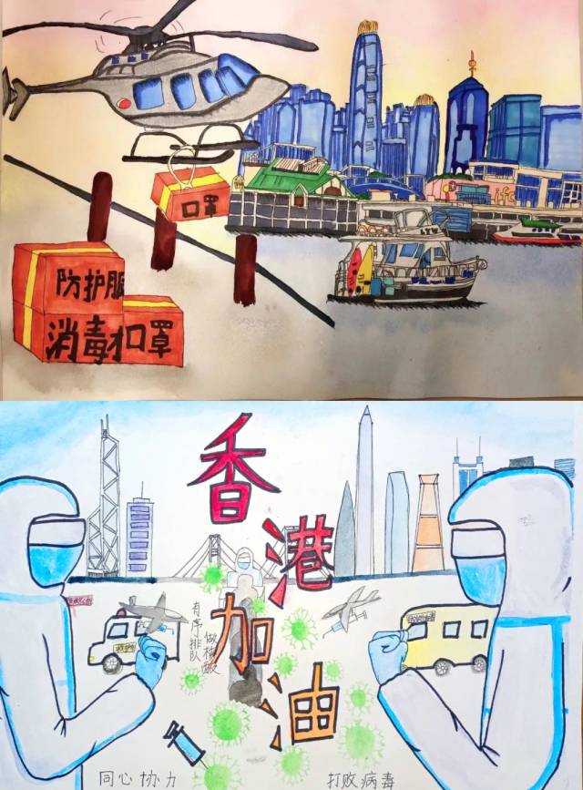 上:作者:姚嘉怡 12岁 作品名称:深港同心 双城抗疫 下:作者:吴佳淇 11岁 作品名称:为香港抗疫加油