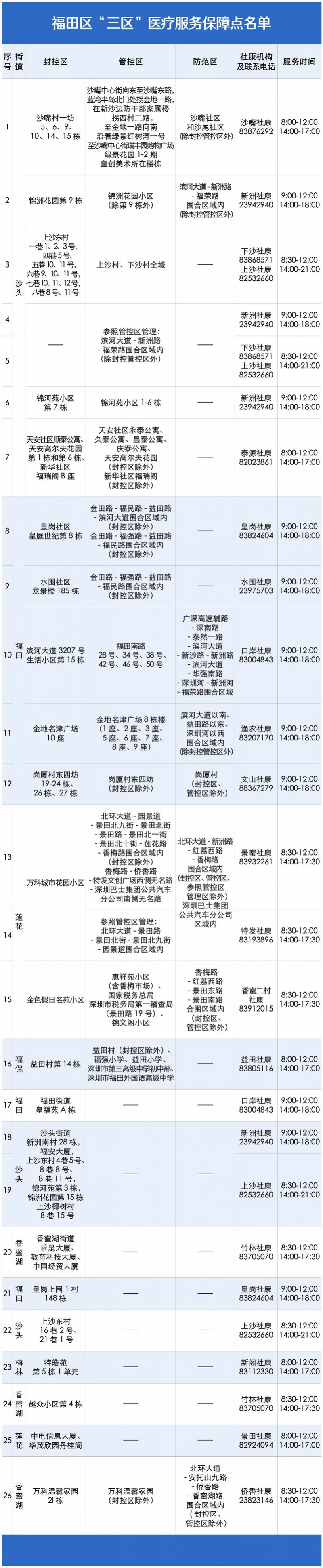 此外,为方便居民就医,福田区在封控区、管控区及防范区内均设置了医疗服务保障点: