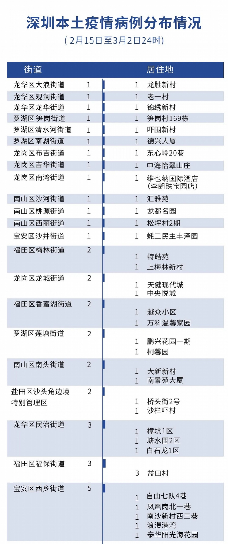 3月3日,深圳市举行疫情防控新闻发布会。深圳市卫生健康委二级巡视员、市疫情防控指挥部新闻发言人林汉城表示,深圳市新增初筛阳性个案数仍然处于高位,新增个案分布于福田、罗湖、南山、宝安、盐田区。全市疫情总体可控,但仍处于不稳定期,防控形势依然严峻。