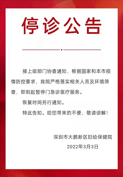 紧急通知!深圳市大鹏新区妇幼保健院停诊